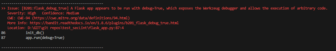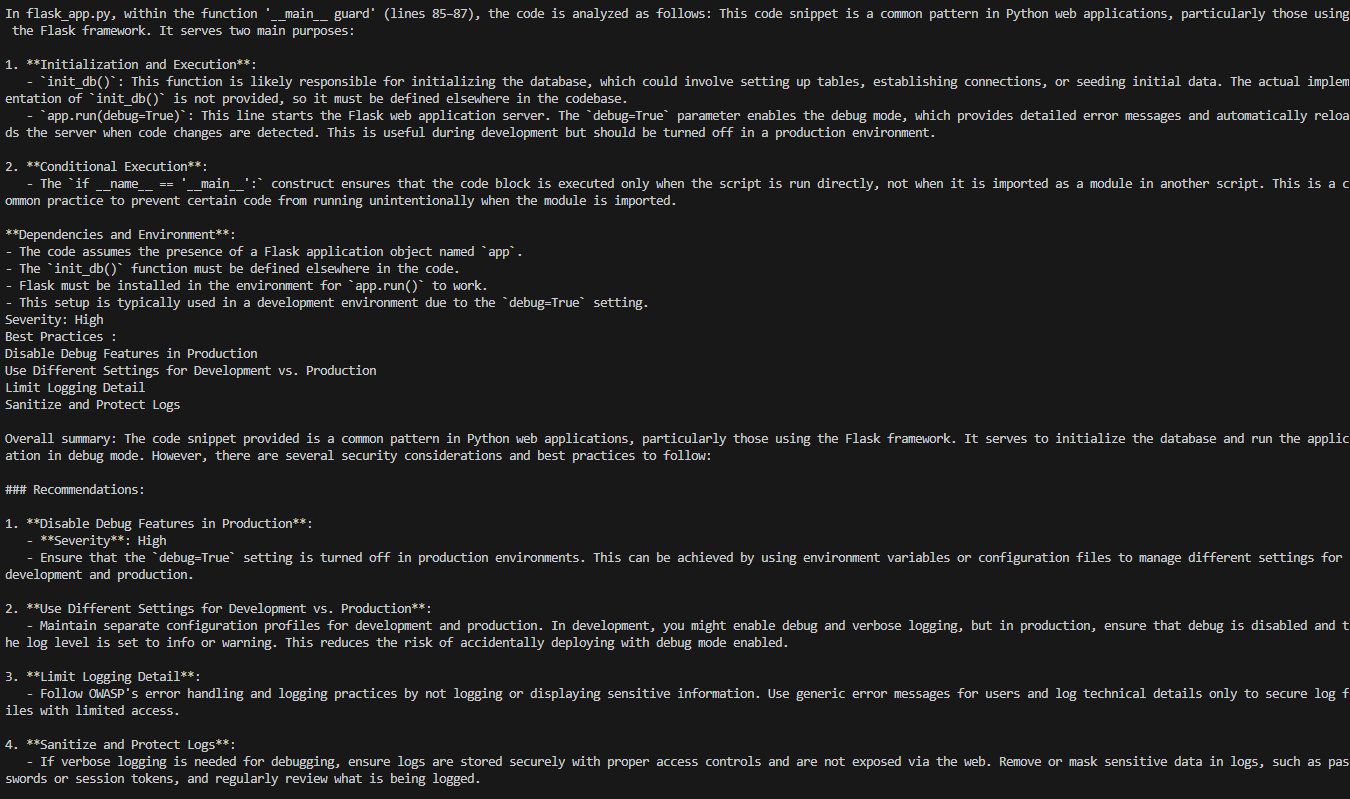 For example, when inspecting the app.run(debug=True) call, Bandit simply flags a B201: flask_debug_true issue at line 87, notes High severity with Medium confidence, and points to CWE‑94 and its plugin docs. SecLint, by contrast, examines the same lines in the __main__ block, explains that the code is initializing the database and launching the Flask server in debug mode, retrieves OWASP best practices (disable debug in production, separate dev/prod settings, limit log detail, sanitize logs), and then synthesizes four actionable remediation steps—complete with severity labels and a concise summary.