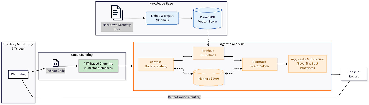 SecLint is a working prototype, but it shows how RAG can improve code security scans. By combining Watchdog, Python AST parsing, OpenAI embeddings, ChromaDB, and a LangChain-driven LLM agent, it provides context-aware vulnerability checks that go beyond static rules. The key lesson: give the AI a knowledge base of best practices (OWASP) and it becomes a far more accurate security assistant.